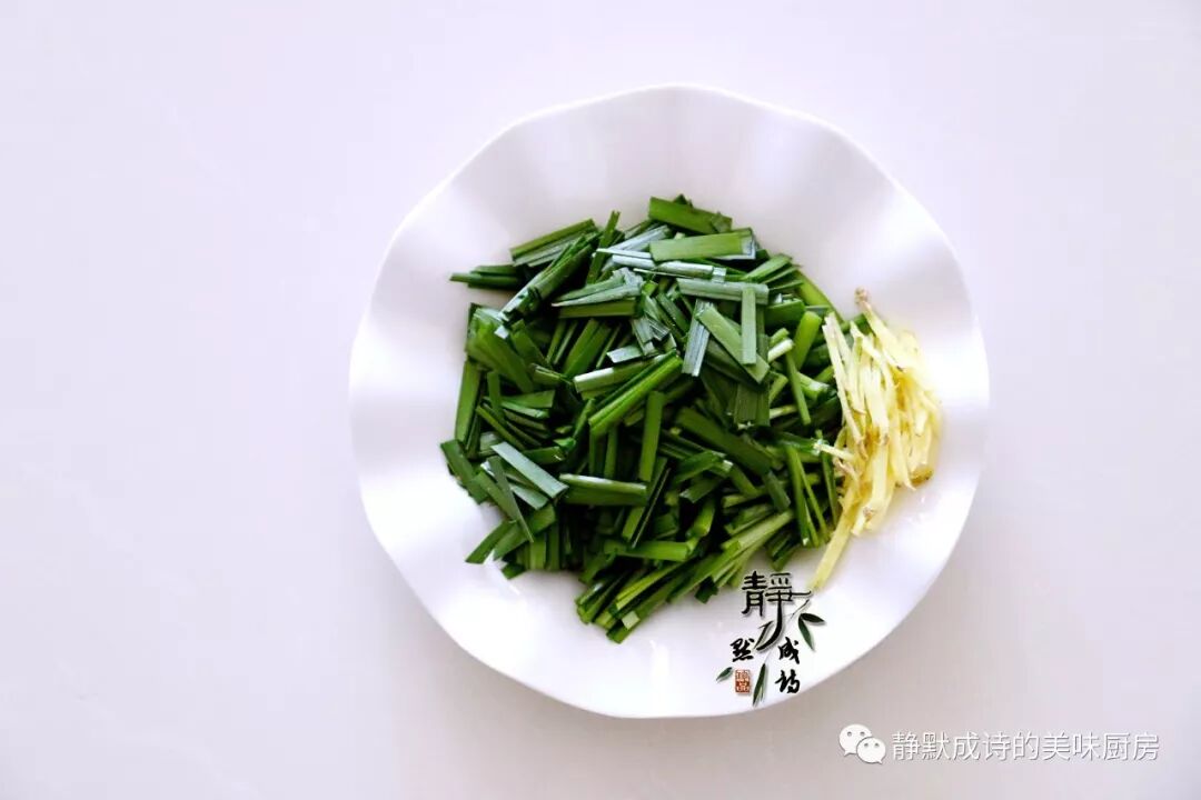 5、韭菜择好洗净切段,姜切丝。春天和冬天的韭菜最为鲜嫩可口,风味颇佳,与河虾是绝搭。