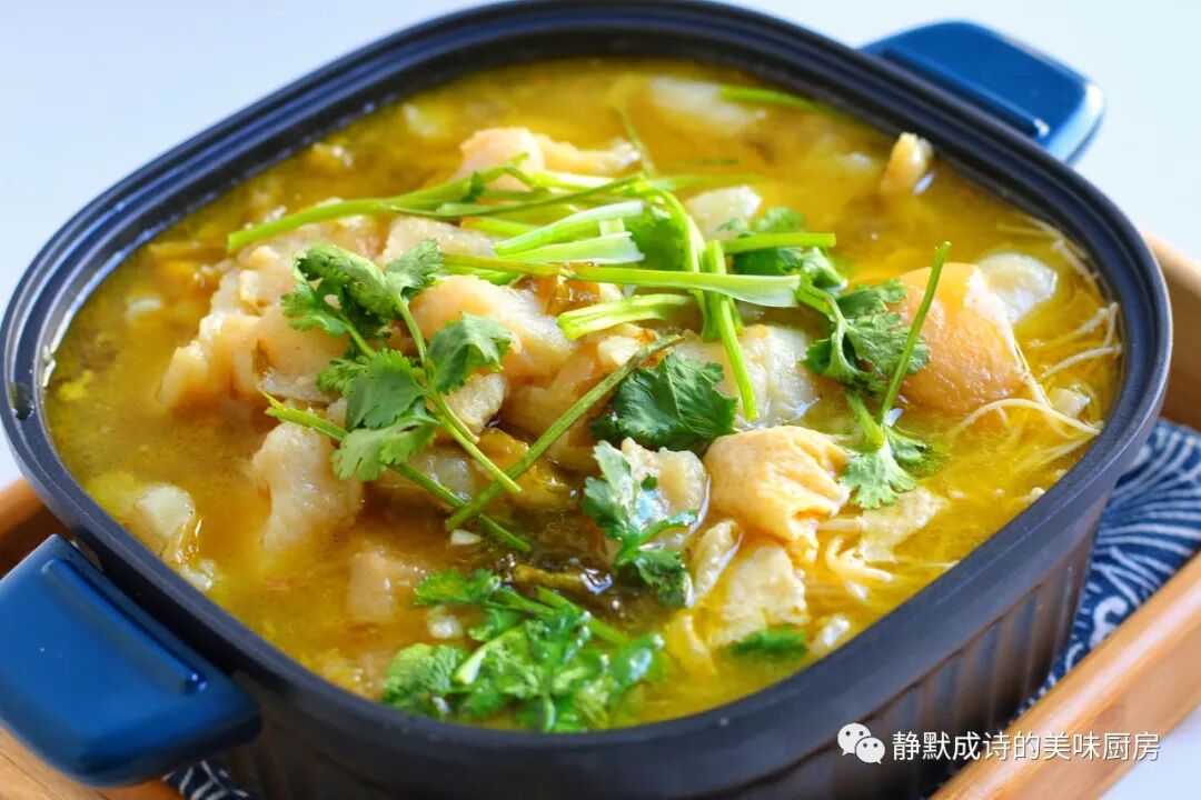 【食材】:龙利鱼柳2块、酸菜1包、黄灯笼酱2汤匙、金针菇2包、豆皮少许、大蒜半头、香菜2棵、油盐适量。