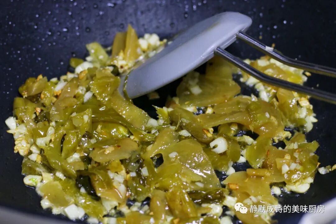 6、然后再加入酸菜,继续翻炒出酸香味儿,再加入黄灯笼酱继续翻炒。