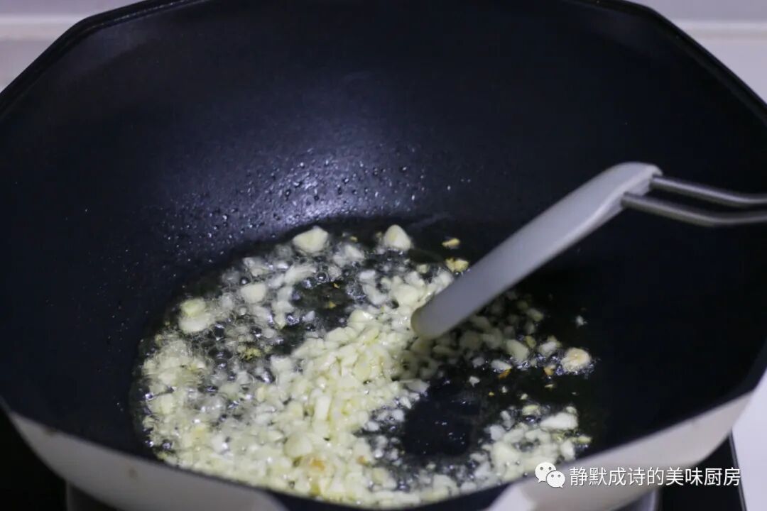 5、热锅凉油,先把蒜末小火煸炒出香味儿。