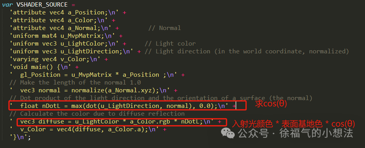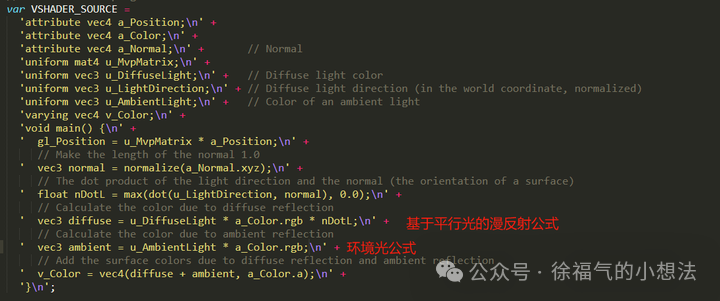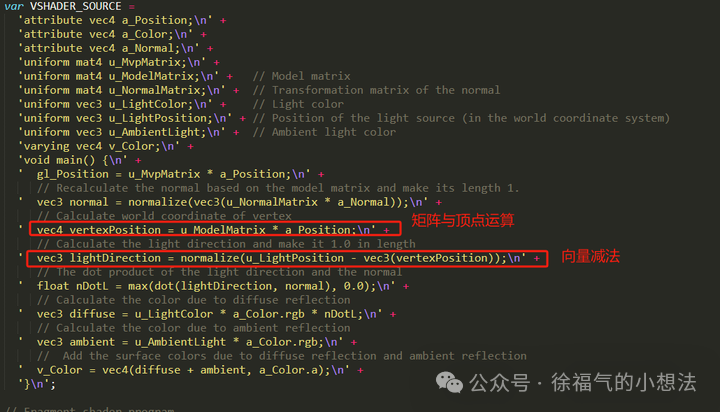 u_LightPosition - vec3(vertexPosition);//得出从顶点指向光源的向量vertexPosition指向u_LightPosition