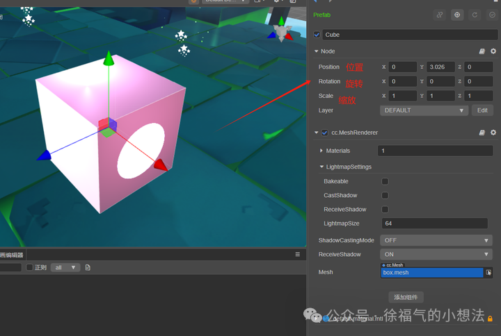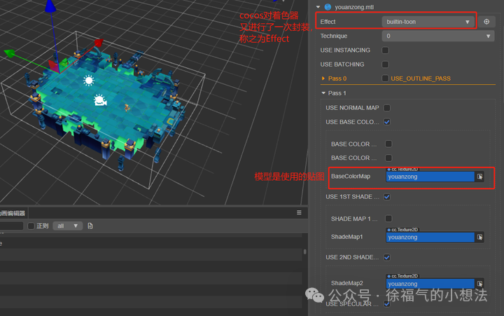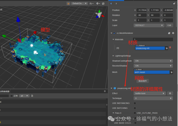 具体就不展开讲了,很简单的,实际研发中把美术给到的模型,往场景上一拖,所有的一切就被自动赋值、联系好了。我们要做的多是写操纵其运动的代码,如果团队中没有TA(技术美术),那么也会兼任写点着色器(Shader,CocosCreator中被封装为Effect)
