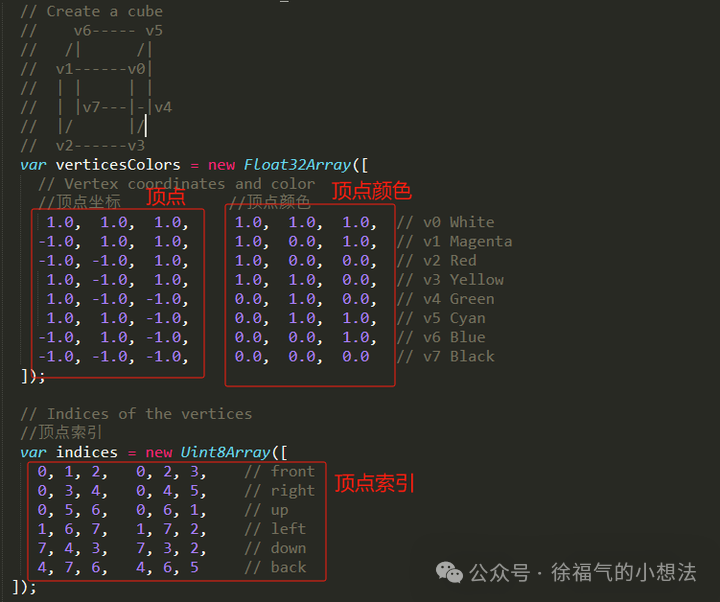 1、要指定立方体每个顶点的坐标,这里把数据直接写死在代码中,实际研发中美术制作的模型文件中会包含所有顶点和顶点之间的连线顺序数据,引擎会读取数据把模型创建出来的。