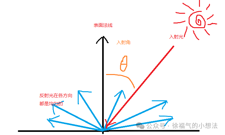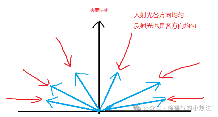 漫反射,其反射光在所有方向都是均匀的,现实世界除了镜子等光滑物体,都是漫反射。