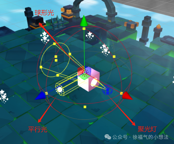 CocosCreator引擎封装了平行光、球形光,聚光灯三种类型的灯光,一般由美术去摆放灯光位置。注意不要摆放太多,会很消耗性能。最好使用光照烘焙技术来避免实时的光照计算,具体参考官方文档。