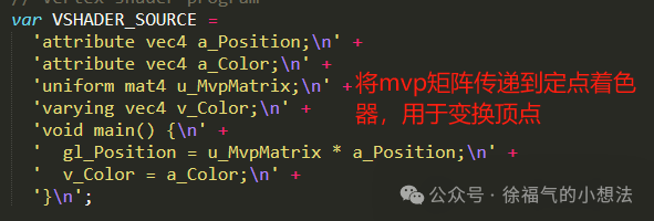 3、在顶点着色器对顶点进行变换,顶点颜色原样传递到片元着色器。