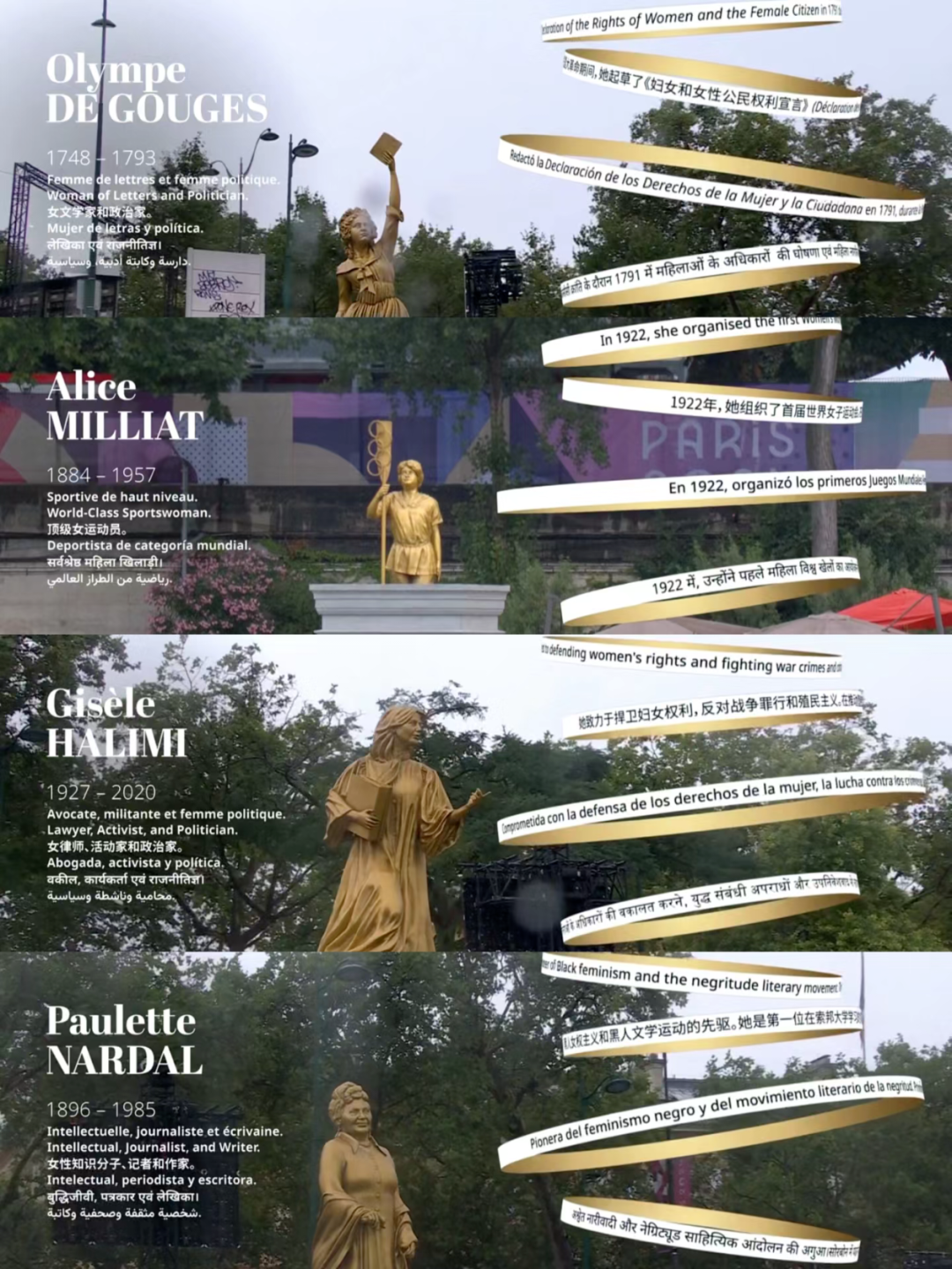 更值得一提的是,开幕式当天在风雨交加的塞纳河边上,缓缓升起了十座杰出女性代表的镀金雕像。