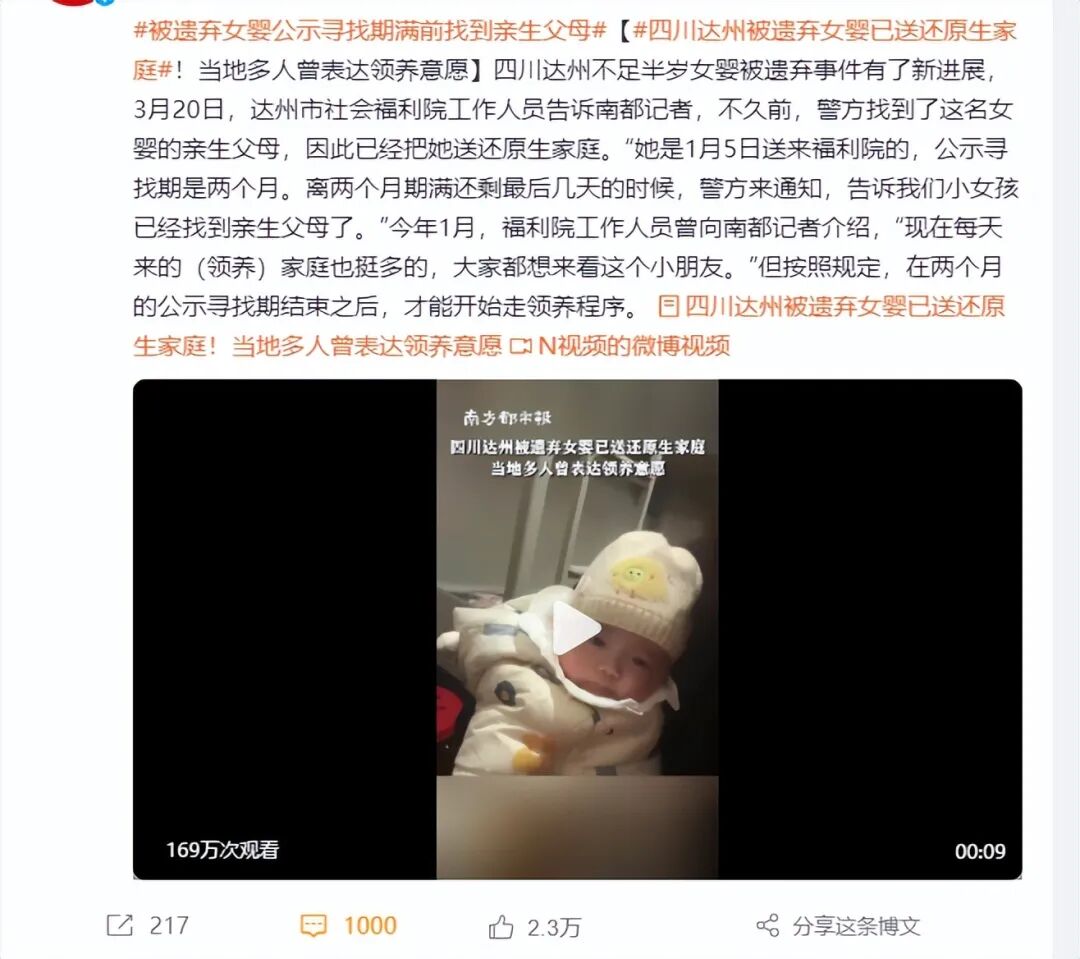 警方通告来了:婴儿被送到了达州市社会福利院,经各方寻找,新生父母找到了,已经送回了原生家庭。
