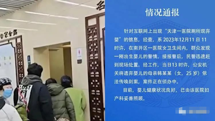 2023年12月11日,在天津市南开区一家医院的女卫生间里,也有人发现了一名刚出生的婴儿。