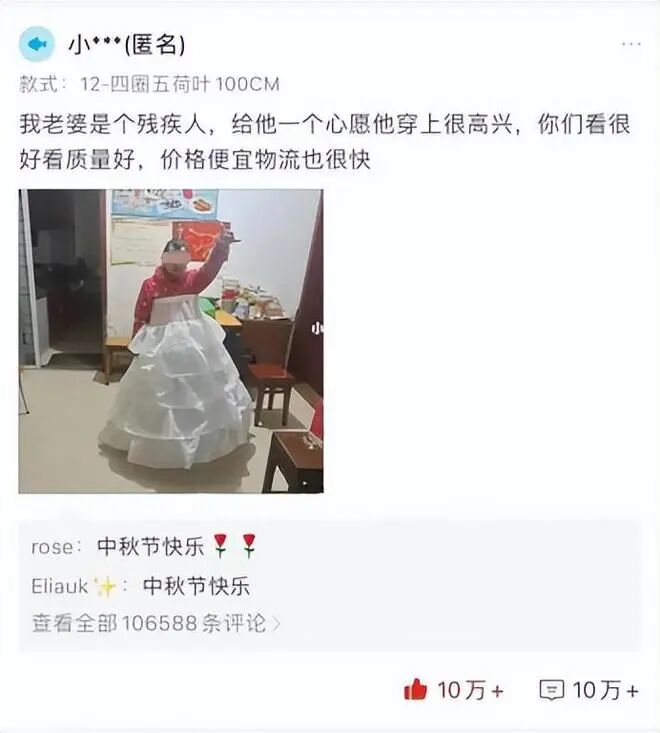 故事的主人公为了满足残疾妻子的婚纱梦,在网上给妻子买了一套38元的婚纱。妻子穿上很开心,他用手机定格了幸福的时光。之后他在评论里晒了图,写下了好评。