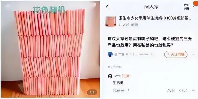 还有网上之前很火的散装姨妈巾,在某APP上很多人买散装的姨妈巾,只因价格便宜,20块钱可以买到100片。