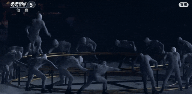 闭幕式文艺演出部分开场,上百名来自音乐、舞蹈、杂技等各领域的优秀艺术家齐聚法兰西体育场,2800平方米的巨大场观瞬间不再空旷。