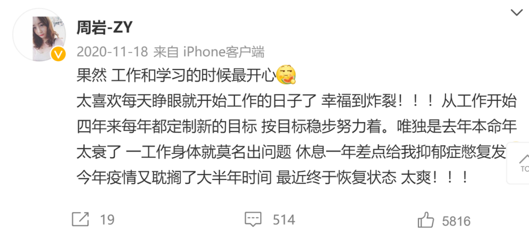 拥有将近20万粉丝的周岩,会在社交帐号里分享自己的生活日常。