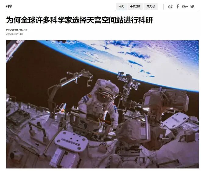 《纽约时报》发表了一篇文章《为什么全球许多科学家选择天宫空间站进行科研》。