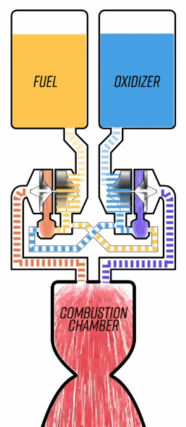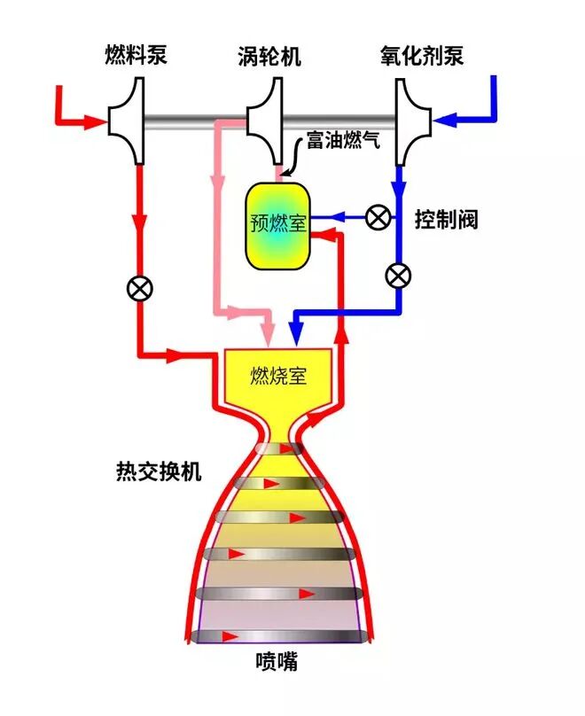 通俗来说就是,火箭发动机,就是将燃料和氧化剂推送到燃烧室,最简单的方式就是燃料和氧化剂罐子是高压,燃烧室是低压,如此一来只需要通过阀门来调节流量,就能让火箭发动机运转。