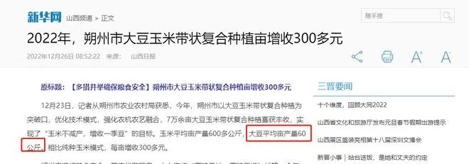 更重要的是,“大豆玉米带状复合种植技术”的大豆产量并不高,2022年朔州市实施了大豆玉米带状复合种植7.14万亩,大豆平均亩产量60公斤。这已经很不容易了,因为这是在确保玉米不减产的基础上,多增收了60公斤大豆。