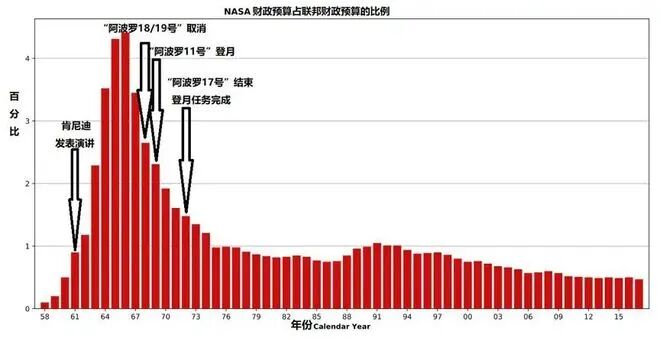 但是,当外部对手消失之后,美国投入到航天领域的钱迅速减少。
