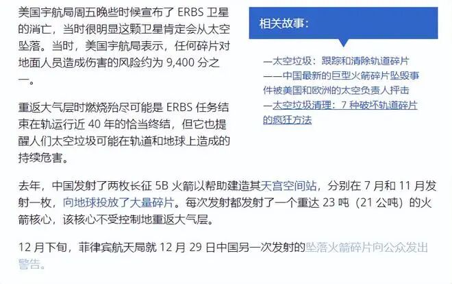 尘埃落定了,美国报废卫星失控坠落地球,没有砸到韩国,落入白令海峡!原本这是非常正常的一个报道,万万没想到外媒报道时又强行扯上中国,在文章末尾又拿中国长征5B火箭说事。