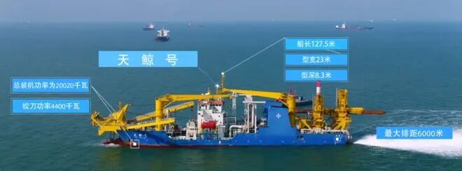 天鲸号总长127.5米,宽23米,深8.3米,总装机功率为200020千瓦,铰刀功率为4400千瓦,建成时亚洲第一,世界第三。