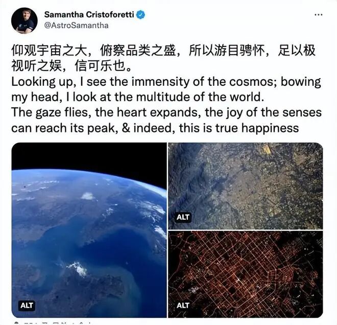 去年10月,Samantha Cristoforetti在国际空间站执行完任务后,在社交网站上还引用了王羲之的《兰亭集序》中的一句话:仰观宇宙之大,俯察品类之盛,所以游目骋怀,足以极视听之娱,信可乐也。