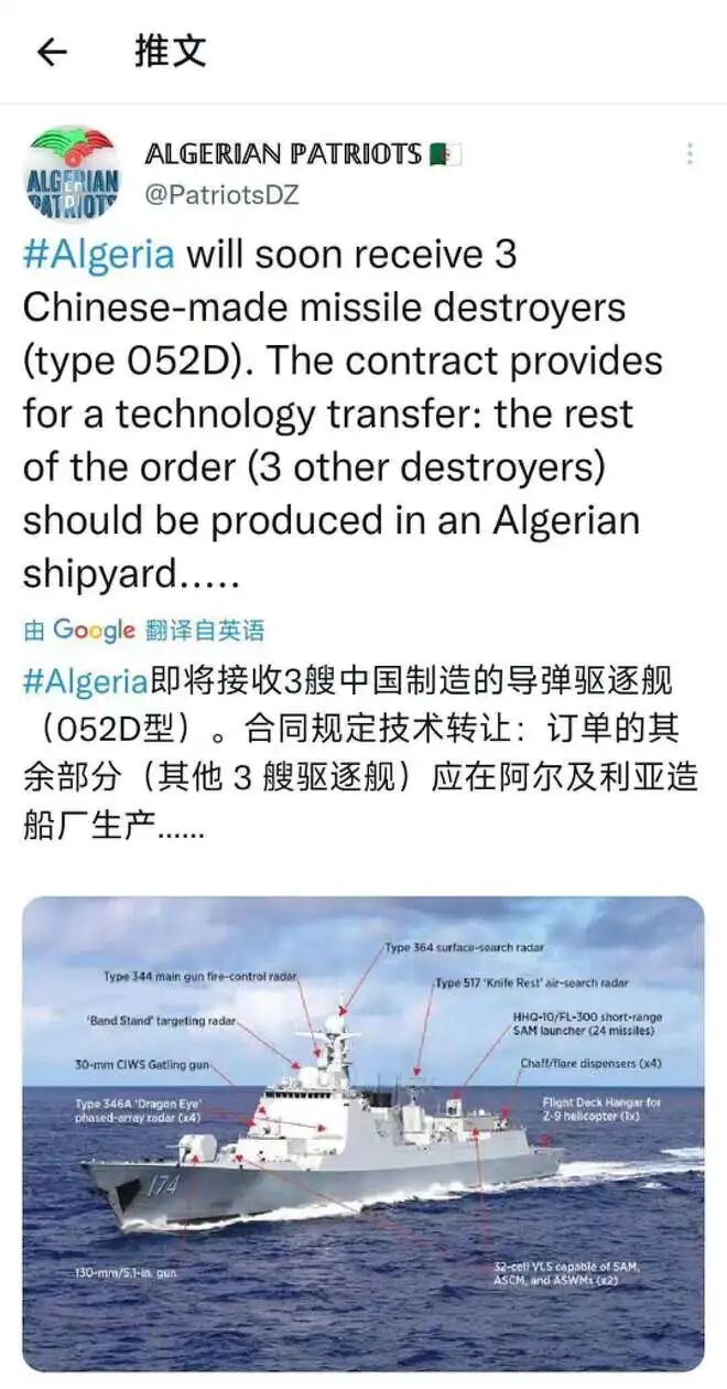 在本次阿布扎比国际防务展中,中国不仅参展,还派出了052DL型导弹驱逐舰162“南宁号”参展,引发了国内外网友的关注。推特上一位叫做“algerian patriots”爆料了一个重磅消息: