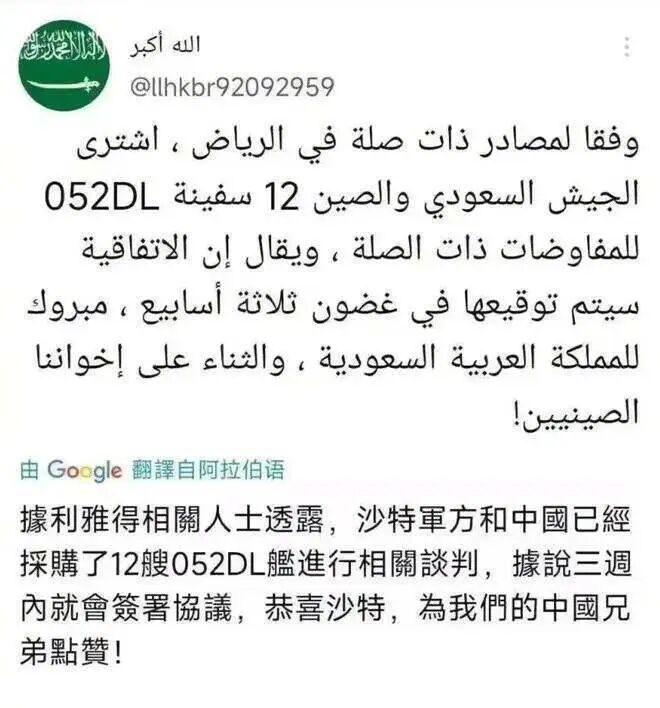 沙特阿拉伯军方就向中国采购052DL导弹驱逐舰,进行了3周谈判,预计在三周内就会达成协议。