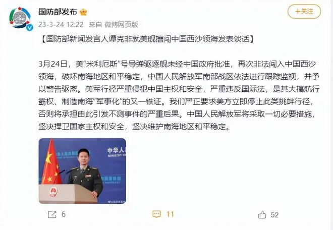 两次非法闯入中国领海,都遭到了我国军舰的跟踪监视和警告驱离。我国国防部还发声表示: