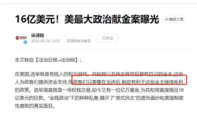 美国虽然自称民主,每个人都可以投选票,但是民众的认知是被媒体们带节奏的,比如:美国前阵子一直在打气球,吸引了民众的注意力,而同一时间发生的俄亥俄州剧毒致癌物泄漏事件却没有媒体报道,民众们被忽悠了还不知道。所以民众以为是自己在投选票,但实际上民众的认知也被这些大财团们牵着鼻子走,他们投的票都是大财团们替他们选好的。