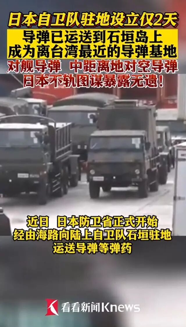 3月,日本决定在冲绳县石垣岛新设陆上自卫队石桓驻地,并在这里部署了导弹部队,目前已经开始往这里运送导弹。石垣岛距离我国台湾省非常近,目的不言而喻。