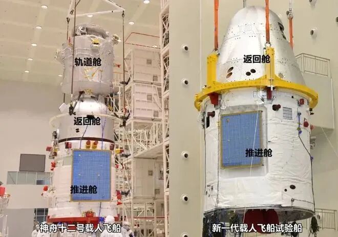 新一代载人飞船,采用的是两舱设计,只有推进舱和返回舱,个头更大了,舱段却变少了,所以返回舱的空间更大了,可以同时搭载7名航天员或者3名航天员+500公斤货物,实现人货一起运输,在返回阶段也可以既载人又带货,下行载荷能力也得到了大幅度提高。