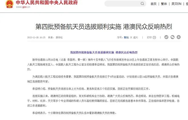 另外,我国还在港澳地区选拔第四批航天员中的载荷专家,港澳青年听到之后都很激动,因为祖国强大了,港澳地区的载人航天梦也实现了,不少人踊跃报名。