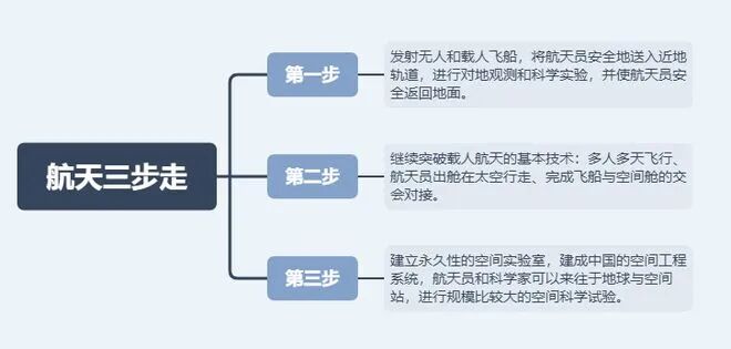 第一步:发射载人飞船,建成初步配套的试验性载人飞船工程,开展空间应用试验。