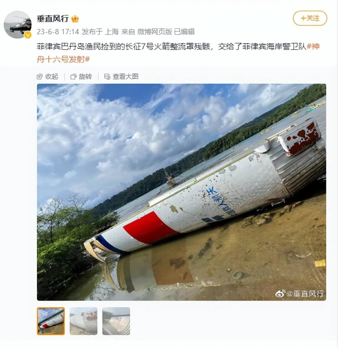 大V“垂直风行”发文表示:菲律宾渔民,捡到了长征7号火箭整流罩残骸,交给了菲律宾海岸警卫队。