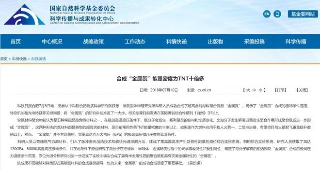 就在大家为“CL-20”的研制成功高兴时,《科技日报》的报道,中科院合肥物质科学研究院的亚历山大·冈察洛夫带领团队,成功研制出了“金属氮”,能量密度是第二代炸药TNT的10倍以上,爆炸威力比“CL-20”还要大上不少。