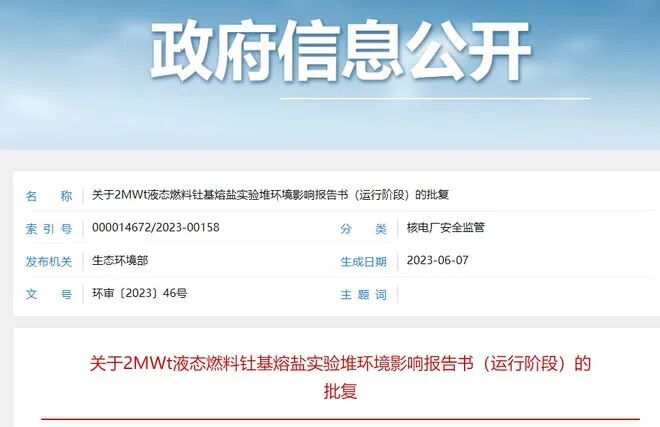 没有了这一层阻碍,我国很快就在2018年开始了“钍基熔盐堆核能系统”的建设,并在2021年建成,启动运行。今年6月,国家核安全局正式为该项目发放了运行许可证,这意味钍基熔盐堆核能系统”即将正式投入运营。