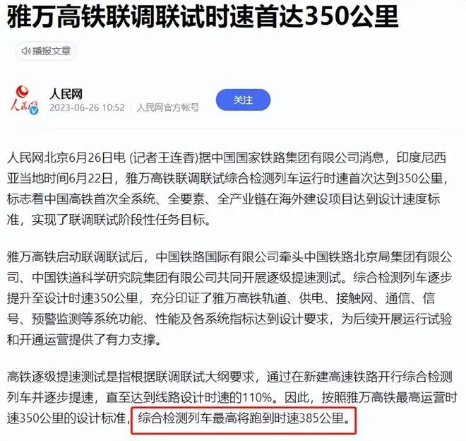 根据中国国家铁路集团有限公司消息,印度尼西亚的雅万高铁,进行了联调联试综合检测,列车运行时速首次达到350公里!按照雅万高铁最高运营时速350公里的设计标准,综合检测列车最高将跑到时速385公里。