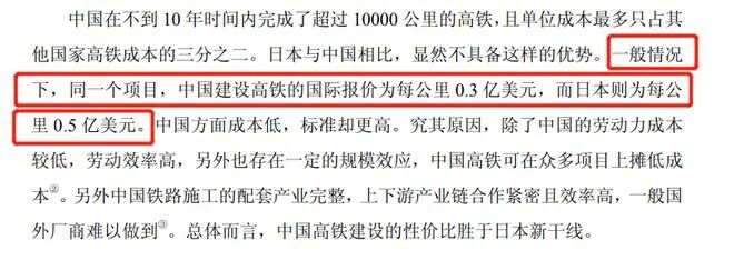 其实从性价比角度,中国高铁技术远远超过日本,当然也包括法国和德国,这也是法国和德国后来不再到东南亚和中国抢订单的原因。中国高铁性价比如此之高,核心原因是:规模优势。中国这些年修建了大规模的高铁,高铁总里程全球第一,如此大的规模,直接摊薄了成本,完善的上下游产业配套。