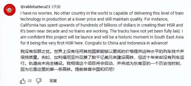 这是美国不想看到的,美国想尽可能遏制中国的影响力,但自己的高铁技术其实也挺捉急的,“加州高铁”就是典型案例,上千亿美元砸了进去,十多年了还修不好,所以美国根本没办法和中国抢高铁订单。所以,雅万高铁修完后,不少美国人都破防了,视频下方经常能看到美国网友在吐槽。