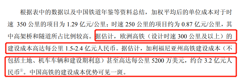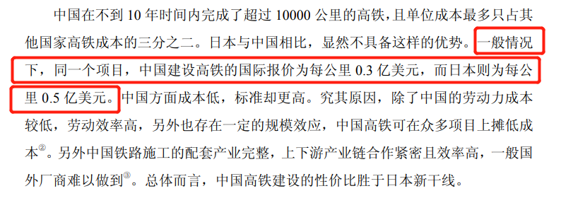 由于我国拥有全球规模最大的高铁,规模效应显著,上下游产业配套极为齐整。因此,规模效应摊薄了成本,这使得我国高铁项目国际报价大概是0.3亿美元/公里,而且建造标准很高,日本在建造标准不如我国的情况下,国际报价仍然需要0.5亿美元/公里,当然了,欧美企业的报价就更高了。
