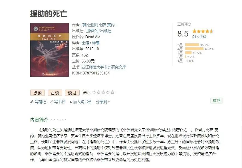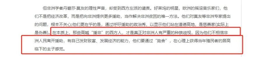 但是西方不管这些,只负责援助,这些援助粮食价格非常低,比当地粮食价格还要低,导致非洲粮食生产逐渐萎缩,越来越依赖西方援助,也越来越被西方拿捏。《死亡援助》的作者认为,西方人对非洲有严重种族歧视,他们不相信非洲离开援助,能发家致富。