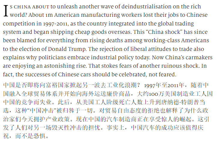 网上很多人说,这是表达中国电动汽车威胁世界,我翻了原文来看,其实它真的没有在污蔑中国,而是已经认清了现实。欧洲的一部分政客确实认为“中国电动汽车威胁世界”,而《经济学人》这篇文章则是在批判这个看法,希望欧美妥协。文章提到,欧美日韩的汽车制造已不是中国汽车的对手,现在不是,未来也不可能是。所以,对中国汽车不应该恐惧,更应该庆幸,因为只有中国汽车才能有助于全球碳中和的目标。