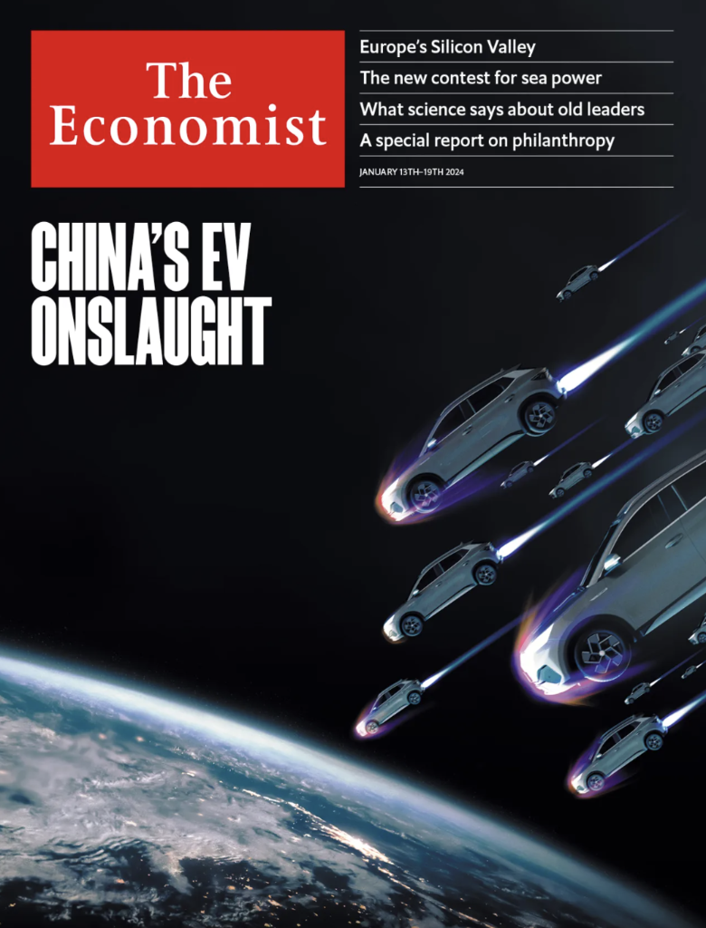 2024年1月,封面是很多中国新能源汽车像是陨石一样,砸向地球。