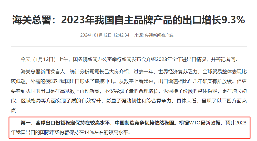 就这么说吧,中国出口国际市场份额,已经连续15年居全球首位。据世界贸易组织(WTO)统计,2018年中国货物出口额占全球比重为12.8%,2019年为13.2%,2020年为14.7%,2021年为15.1% ,2022年为14.7%。2023年,预计也会保持在14%左右的较高水平,其中自主品牌产品的出口更是增长了9.3%。