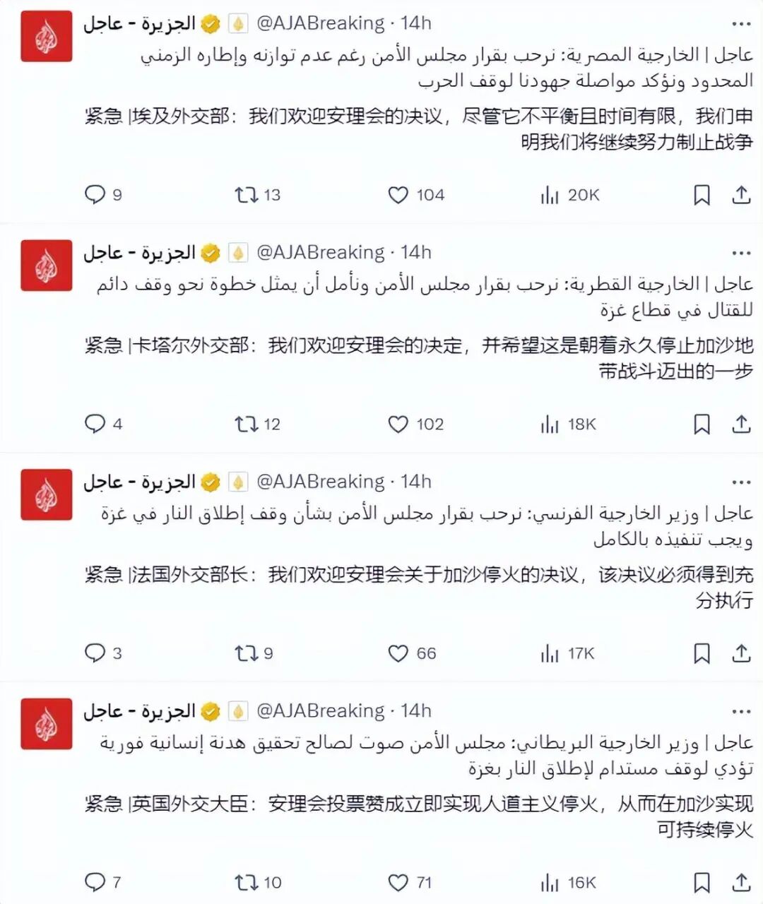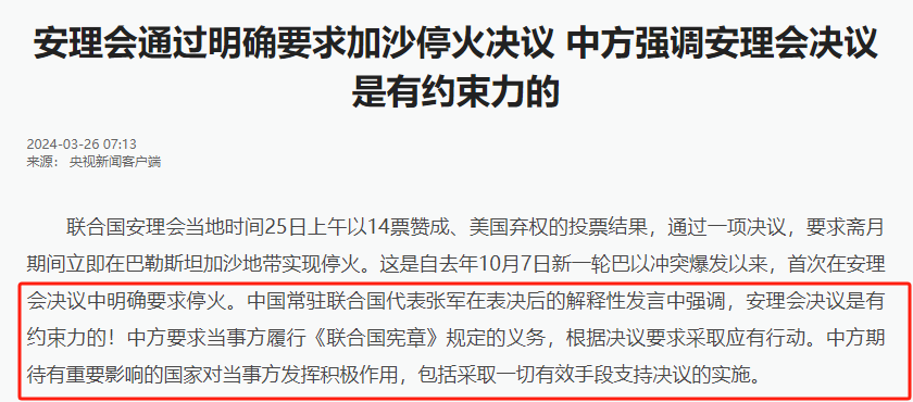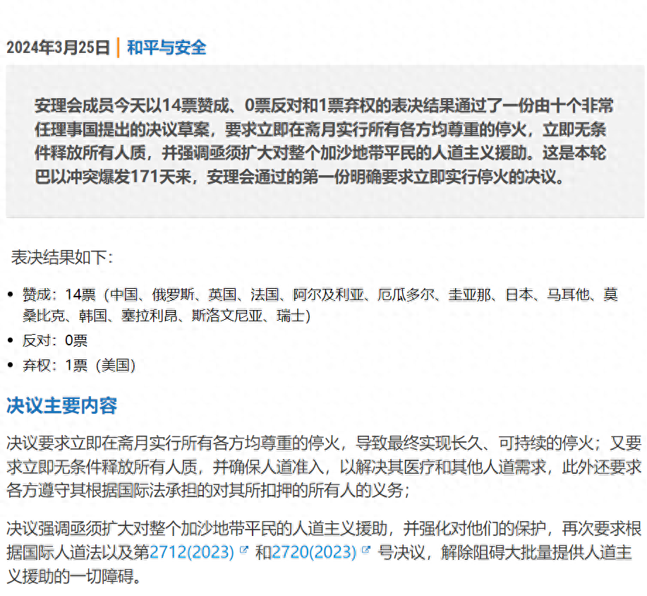 更狠的还在后面,白宫发言人马修·米勒在接受提问时,被问到“你认为以色列会宣布停火吗?”,他说,我不知道,我认为安理会决议无约束力。emmm....咋说呢,只能说这个回答很美式。当年美国通过联合国来制裁指责朝鲜、伊朗时,明明不是这么说的。
