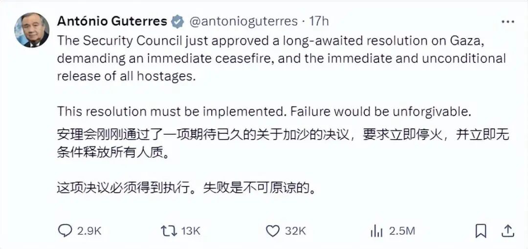 这个决议对于被夺去生命的32000多无辜平民来说,来得太迟了。正义虽然会迟到,但终将胜利。经过几个月的努力,联合国安理会终于通过了一项决议,要求加沙斋月停火。这次是14票赞成,1票弃权,这次灯塔国终于不投那该死的否决票,而是投弃权票,全场出现难得的掌声,真是天下苦美久矣。