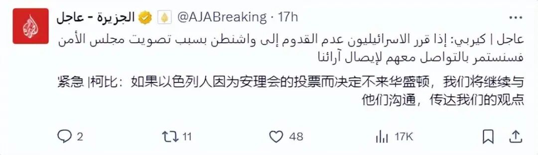 看到决议通过,以色列第果然取消了代表团访问华盛顿。国家安全委员会战略沟通协调员柯比表示,我知道以色列很着急,但我比你更着急。