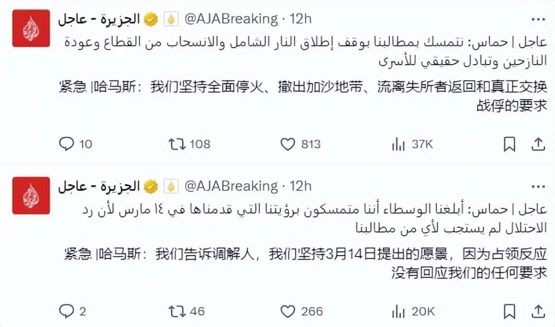 哈马斯表态,愿意坚持全面停火,交换战俘。