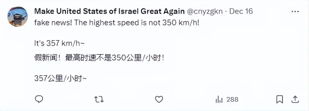 还有人说,这是假新闻,中国高铁最高时速不是350公里,而是357公里。