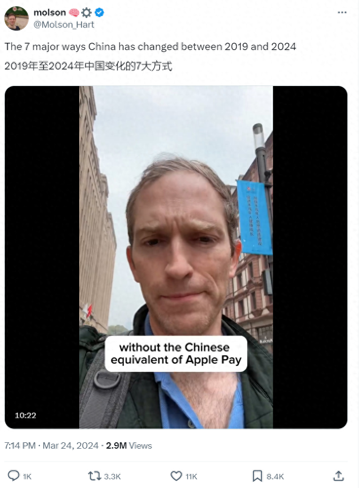 最近总有些事,大殖子们破防。有个叫做莫尔森的美国人,以前是一个出了名的中国黑。时隔5年后,他重新来到中国,然后他拍了一段视频,讲述了他认为的,2019年-2024年中国的七大变化,在我录视频的时候,这个视频播放量已经到了200多万,引发了广泛的关注。那是哪七大变化呢?