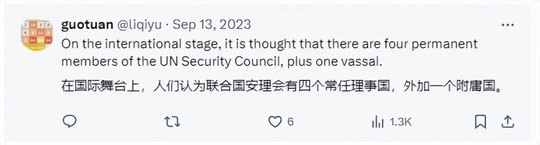 还有人更狠,说在国际舞台上,人们认为联合国安理会有4个常任理事国,外加一个附庸国。那这个附庸国是谁呢?不要忘记帮我点赞和关注哦,爱你。